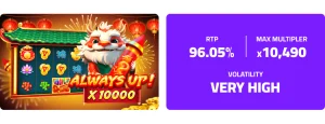Always Up! x10000 has a Return to Player (RTP) of 96.05%. This sits right at the industry average of 96%, offering fair returns over long sessions. RTP is a theoretical long-term average calculated over millions of spins, not a guarantee for any single session.