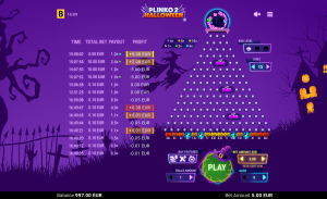 Use the +/- buttons to choose your bet per spin. Bets on Plinko 2 Halloween range from £0.1 to £25.